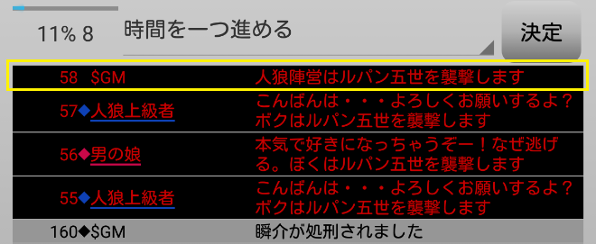 夜会話の結果、ルパン噛みが決定された(上の図)。それでは!真占い師を噛めれば嬉しい!4日目よ来い来い!そいっ!
