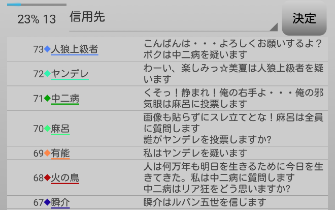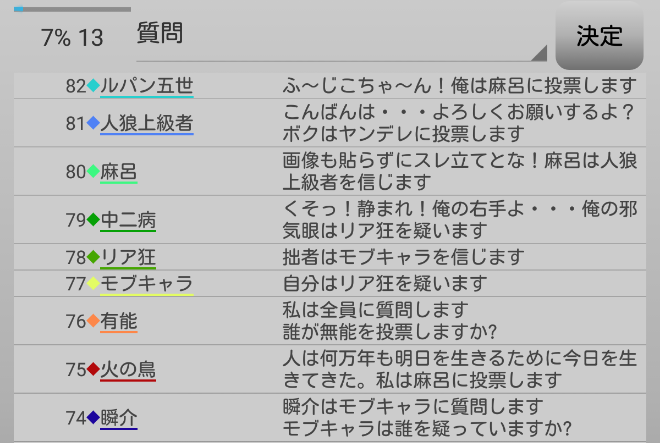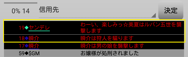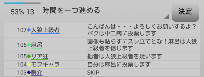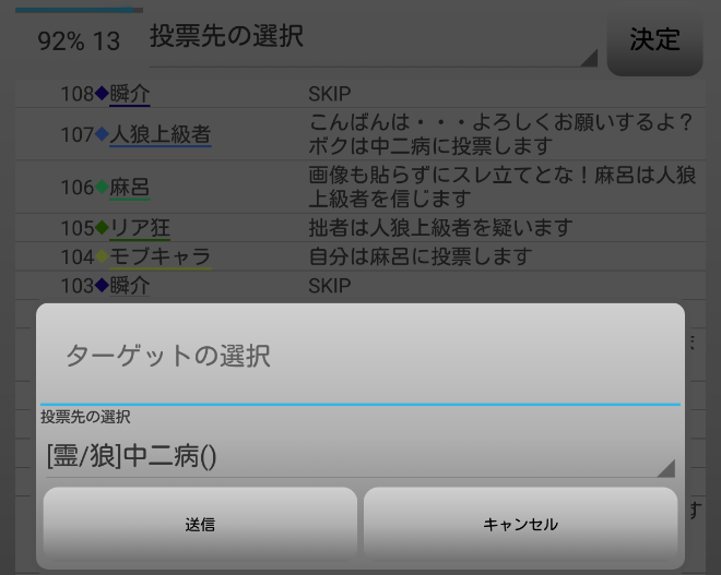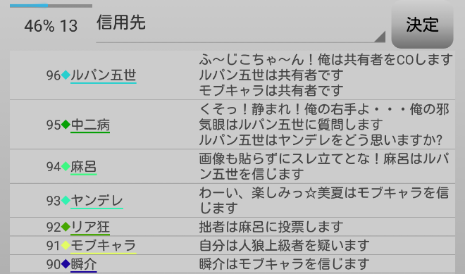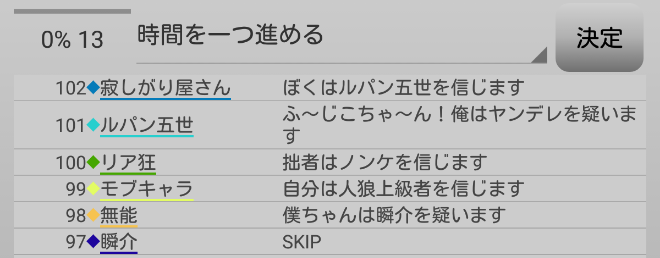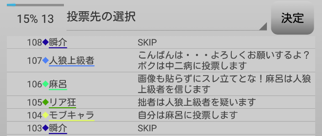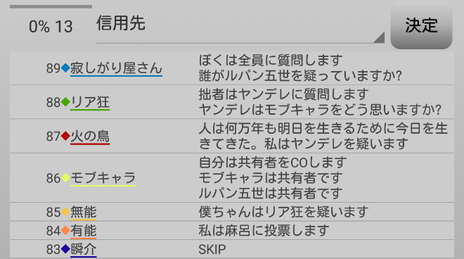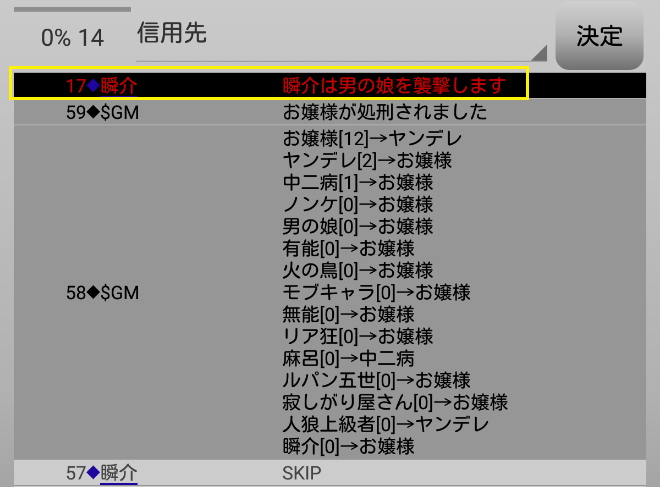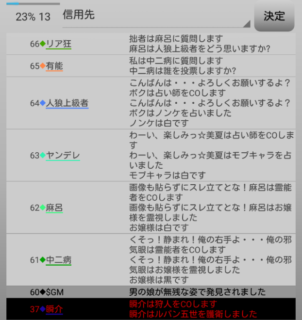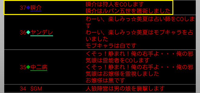 瞬介「男の娘噛みを主張しておいた(上の図)。相方人狼からの応答が無いんですが?ヤンデレ占い師は占い先を考えているのか?中二病は霊ロラされるから絶望しているんですか?」