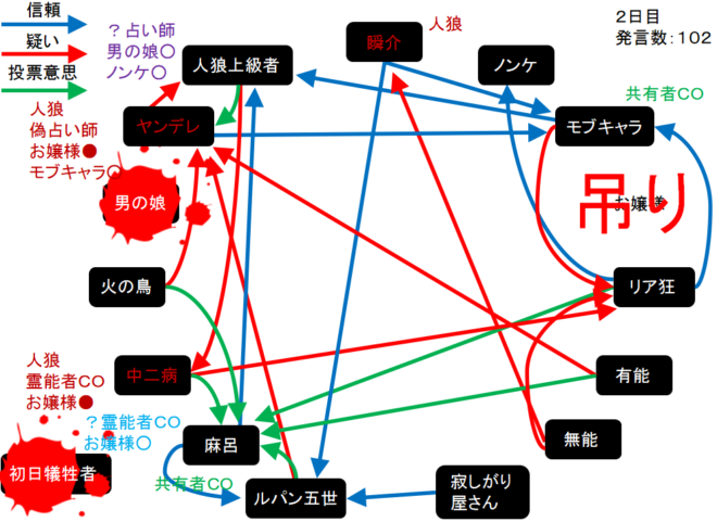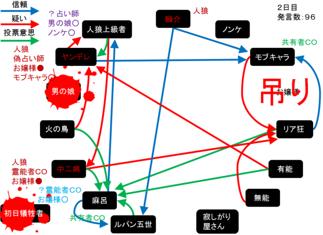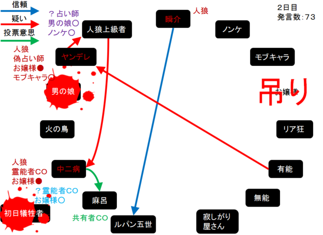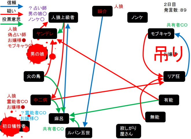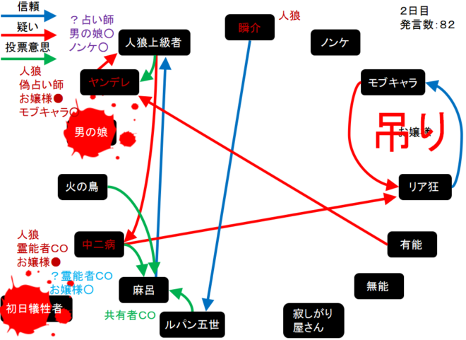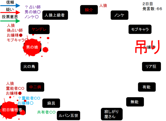瞬介「噛み先は男の娘に決定した(上の図)。そしてヤンデレの偽占い結果はモブキャラ○、中二病の偽霊能結果はお嬢様●だ」