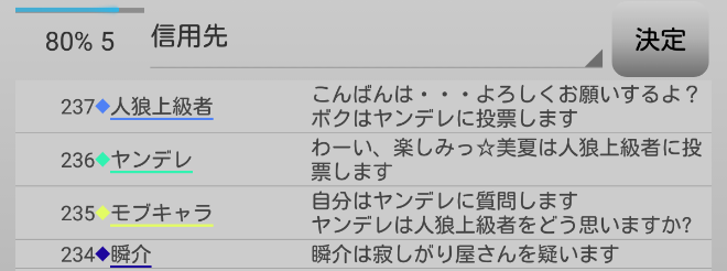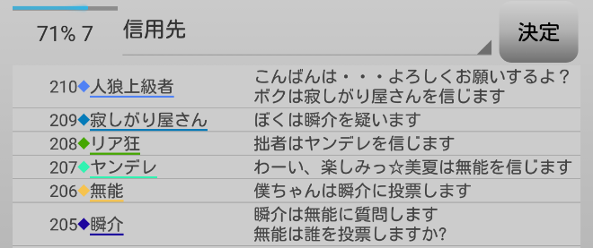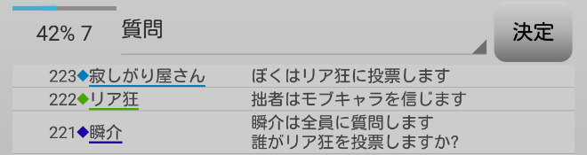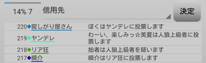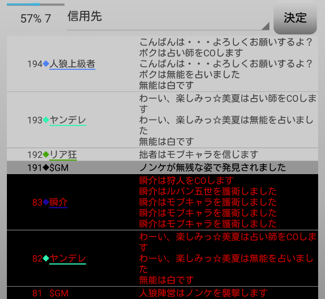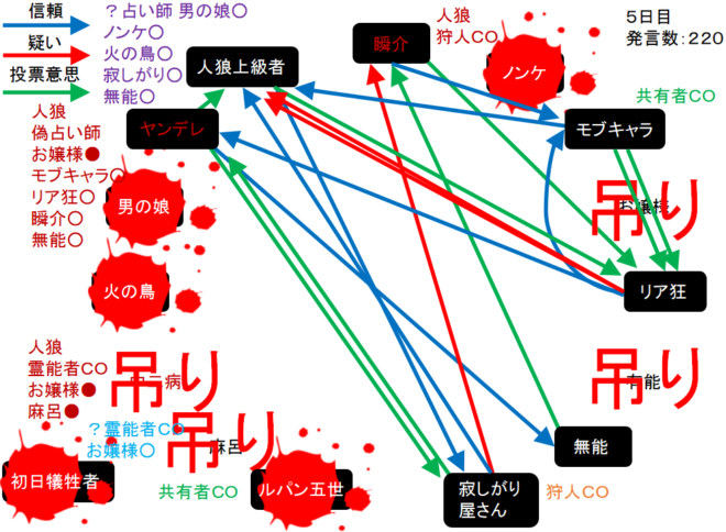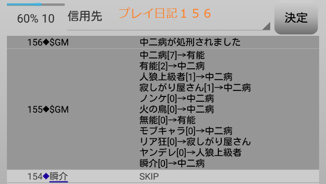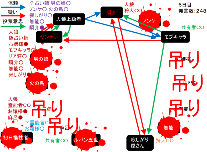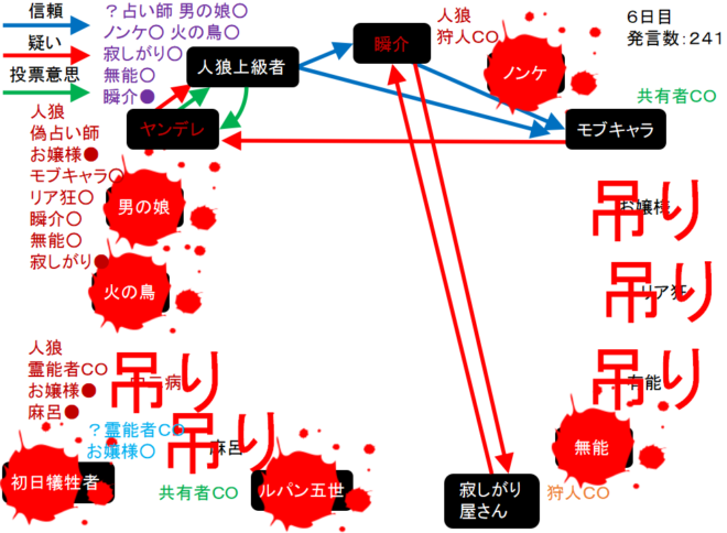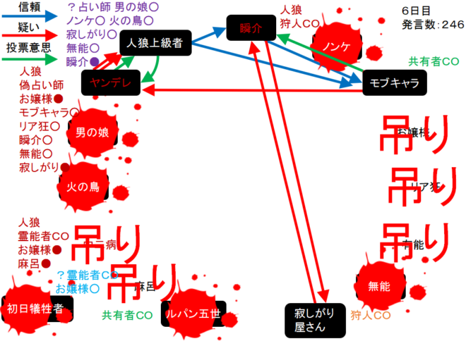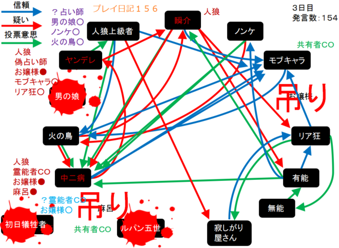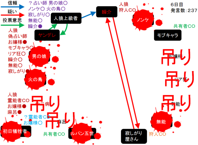 瞬介「ノンケ噛みを提案しておいた(上の図)。寂しがり屋さんも強いプレイヤーだ。しかし、寂しがり屋さんはリア狂へ信頼発言をしているんだ。ノータイムで有能へ投票宣言をしたノンケも怪しいが・・・もうわからない!」