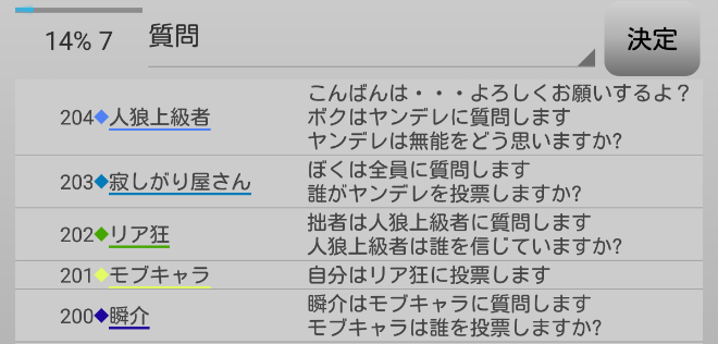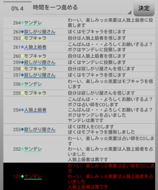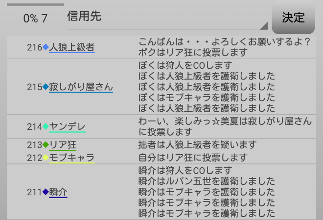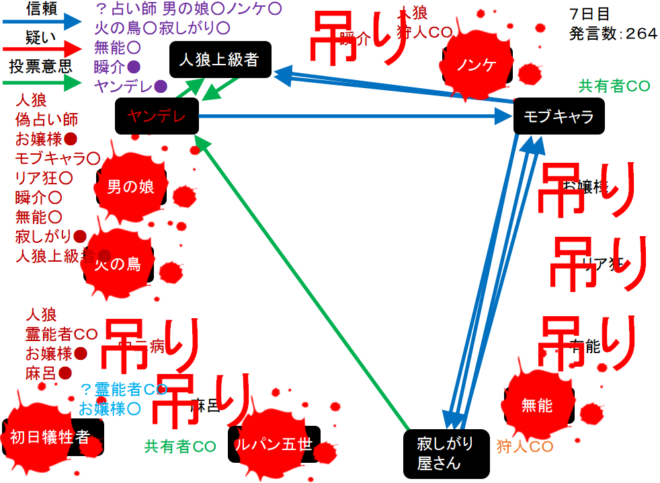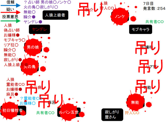 LWのヤンデレは共有者のモブキャラ噛みを決断(上の図)。そして対抗占い師へ●を出すようです。それでは!7日目よ来い来い!そいっ!