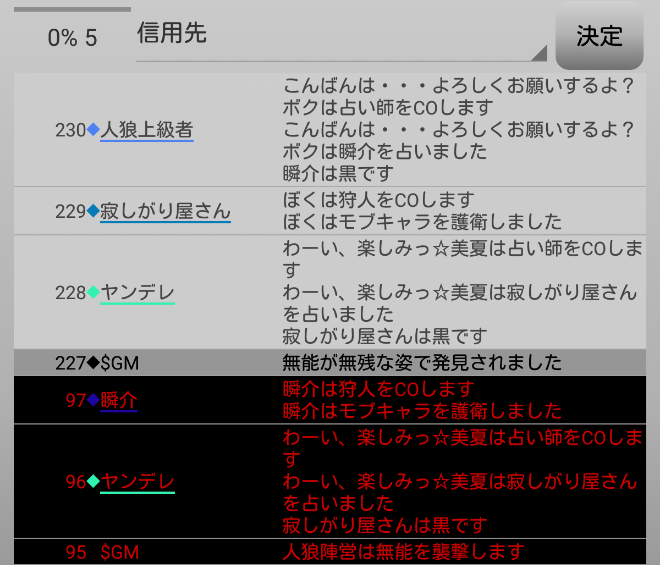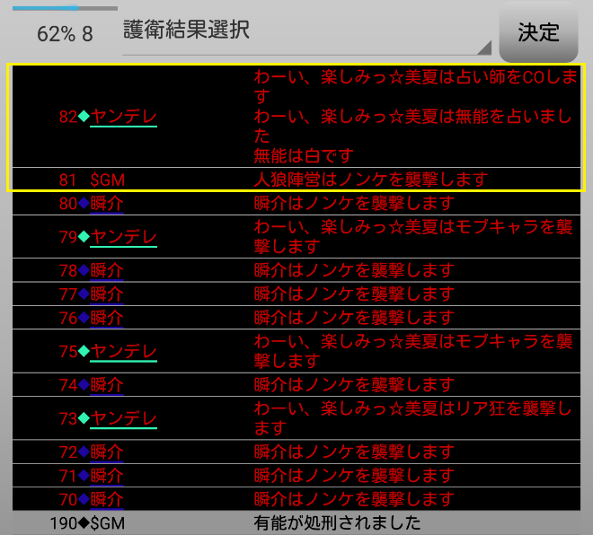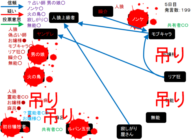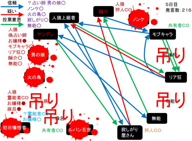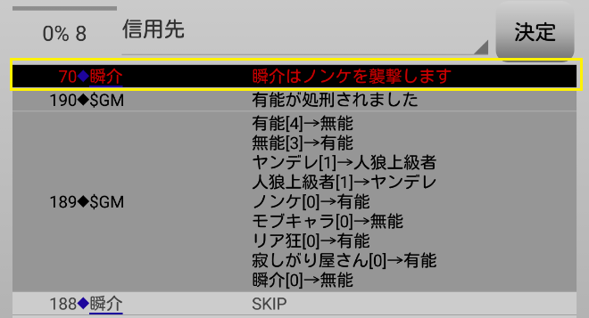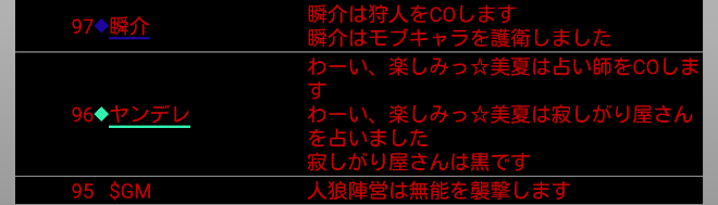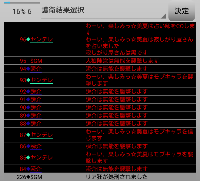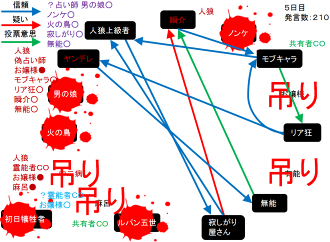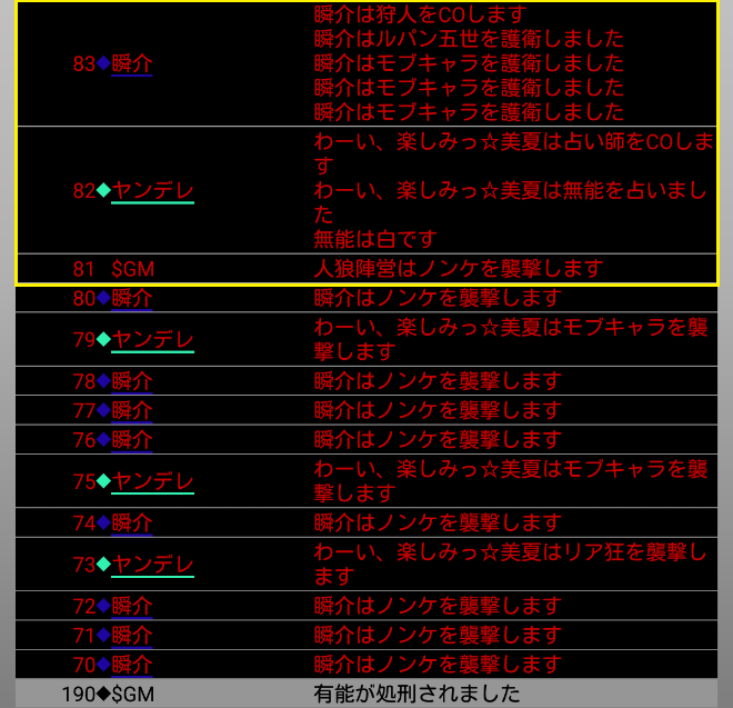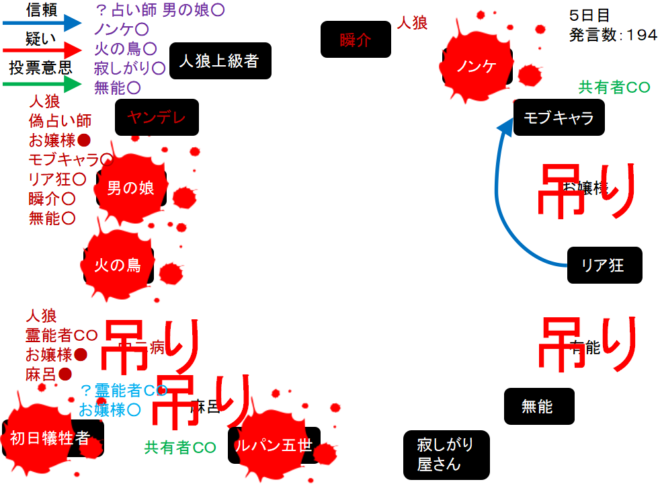 瞬介「襲撃先はノンケに決定した(上の図)。そしてヤンデレの占い結果は無能○だ。無能が妖狐だったら呪殺に合わせられるナイスな占い結果だね。俺は共有者モブキャラの護衛結果を作ろう」