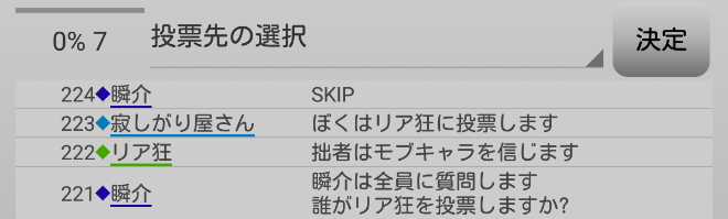 瞬介「対抗狩人の寂しがり屋さんがリア狂投票を決断してくれたけど(笑)。も、もうだめだあ。最後の発言になります。意思は示したので『スキップ』します!」