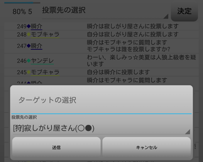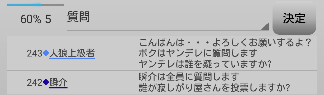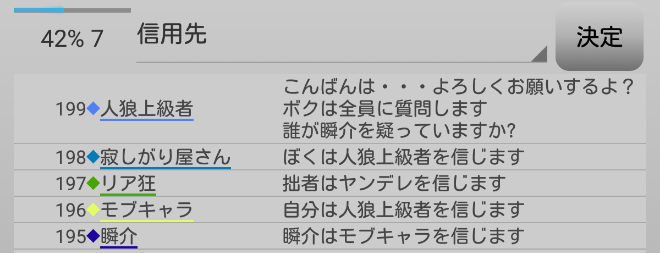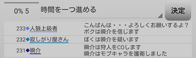 瞬介「人狼上級者が俺に●を出したくせに信頼してきて気持ち悪いんだけど(笑)。俺は『寂しがり屋さんを疑います!』」