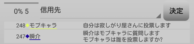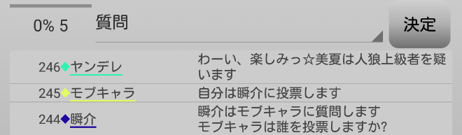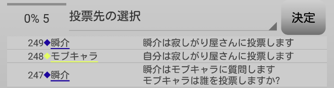 瞬介「俺が共有者に投票をされて負ける(泣)。諦めずにもう一度質問をするぞ。『モブキャラは誰に投票をしますか?』」