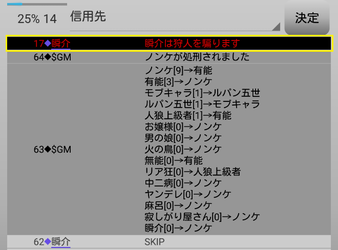瞬介「その前に騙る役職を狩人に変えておこう(上の図)。噛み先が決定するまで人狼上級者噛みを提案し続けます」