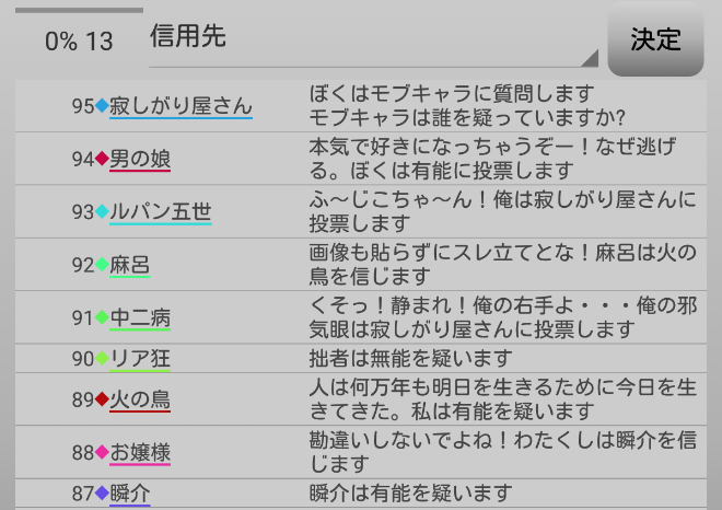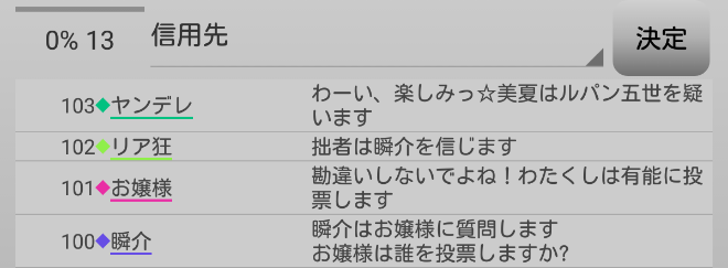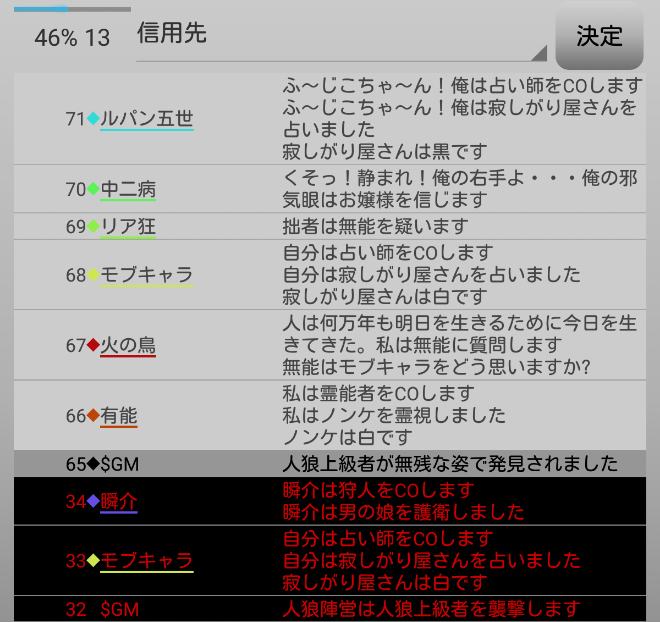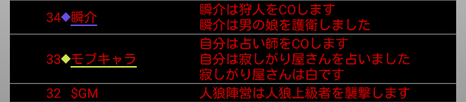 瞬介「占い師に疑い発言をしたグレーは『お嬢様、麻呂、中二病、火の鳥』だ。この4名は妖狐か背徳者の可能性が高いので噛み先から外そう」