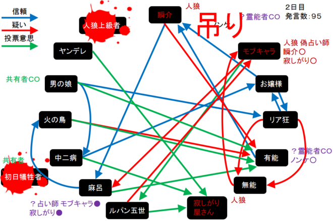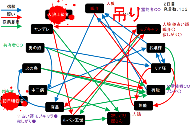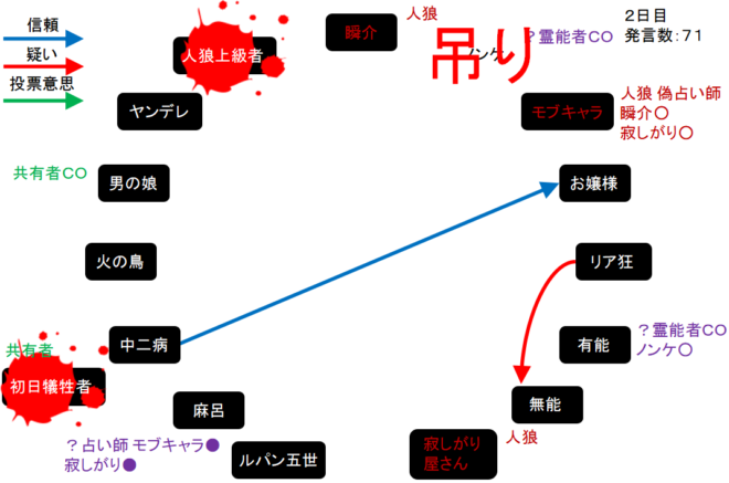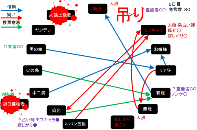 瞬介「噛み先は人狼上級者に決まった(上の図)。そしてモブキャラの占い結果は人狼の寂しがり屋さんへ○出しだ。堅実な占い結果だね。モブキャラは頼りになる」