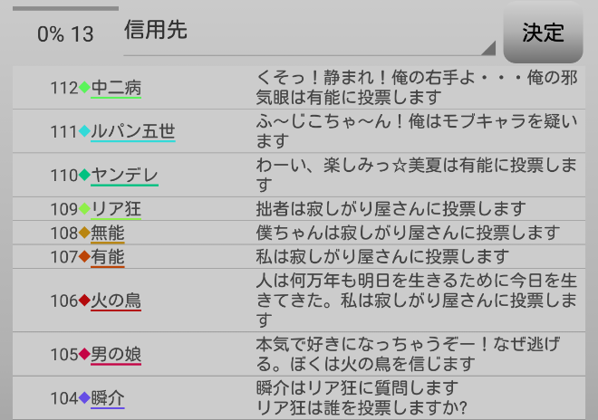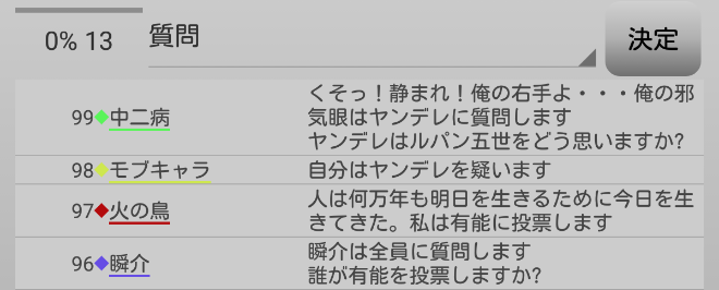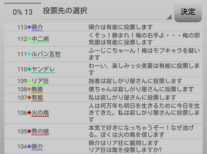 有能(霊能者)の処刑を目指さなければいけない。明日、モブキャラが偽●を出して寂しがり屋さんが一命をとりとめる可能性もあるからね。全員に質問します!『誰か有能に投票する人はいますか?』。