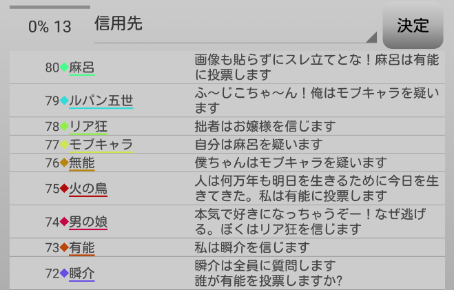 麻呂が有能に投票を決断したようだね。麻呂は情緒不安定性が低いので簡単に投票先を変えないだろう。信頼しておこうぜ。俺は『麻呂を信頼しています!』。