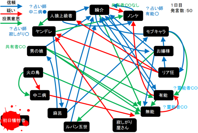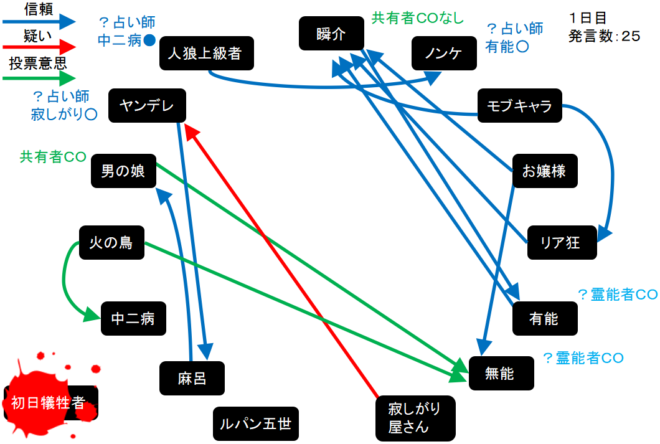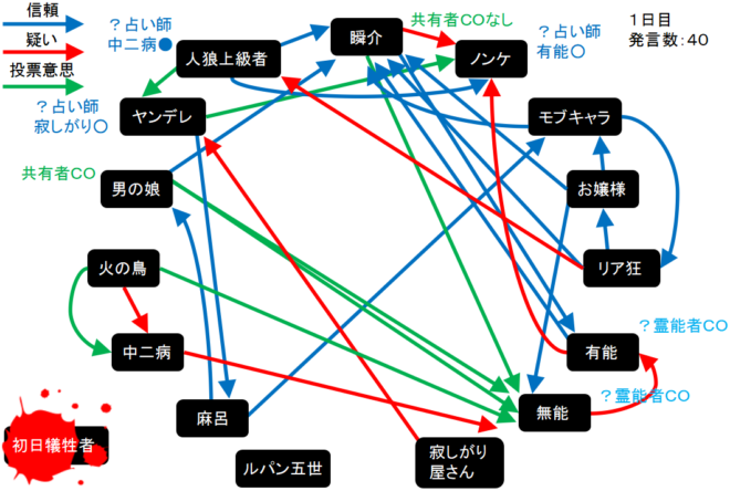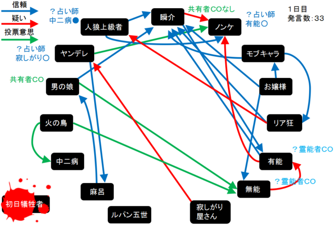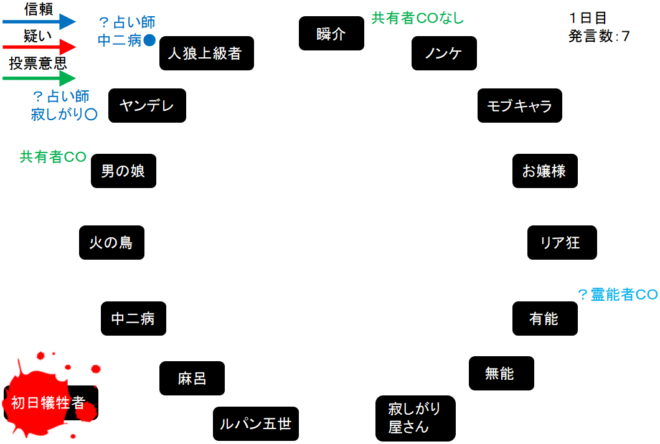 瞬介「共有者2人のCO結果が作られた(上の図)!それでは!グレランで吊られちゃったらすみません。1日目の議論よ来い来い!そいっ!」