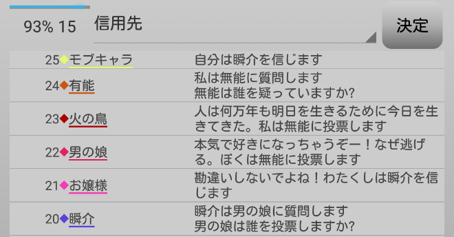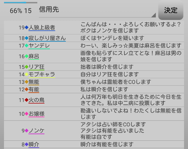 瞬介「人狼達の役職者COを見たい。火の鳥からの質問に答えてターンを進めよう。俺は真霊能者の『有能を信頼しています!』。