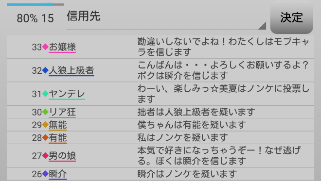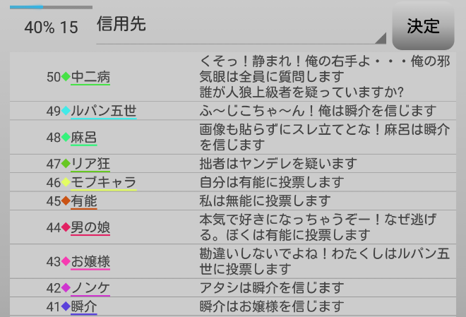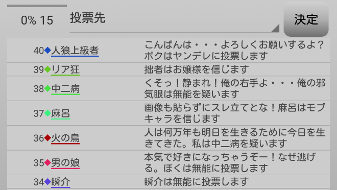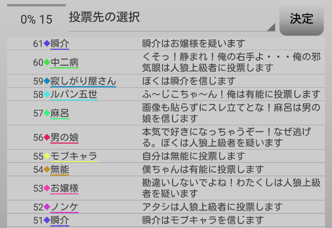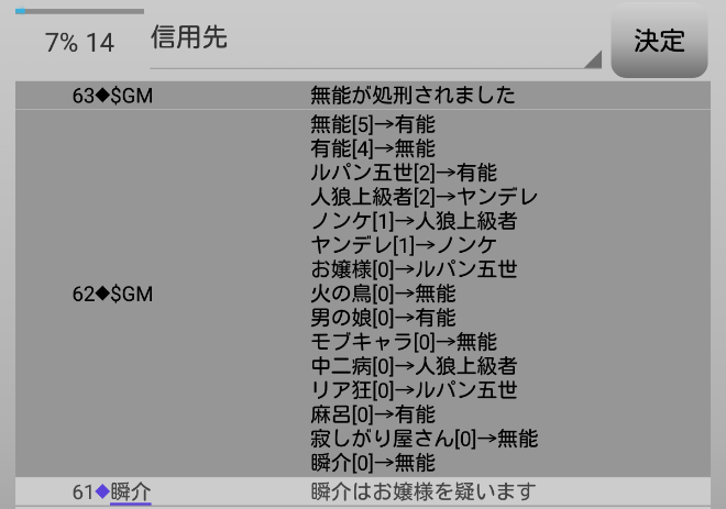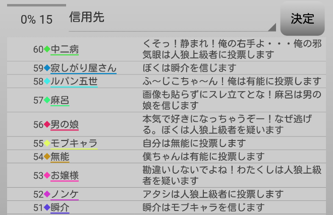 瞬介「発言表を作っている間に戦略を思いついたぞ(笑)。今日は無能(人狼)吊り、無能へ投票をしない者を観察して潜伏人狼候補を絞ろう。そして2日目は共有者COをして中二病吊りだ」