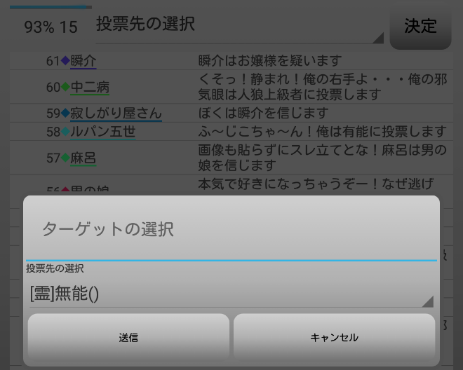 どちらにするのか?今日の方針が●吊りなのか霊ロラなのかで選びます。共有者の男の娘さん!今日は誰を吊るんですか?『男の娘は誰に投票をしますか?』。