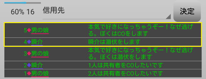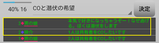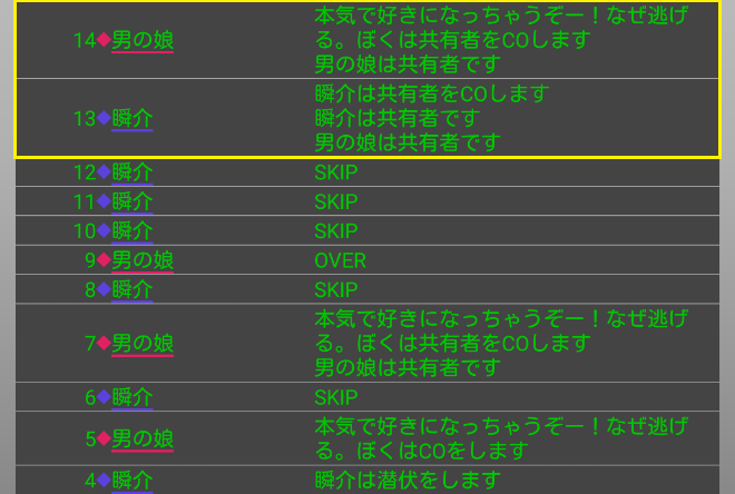 瞬介「1人が潜伏で進行する意見が通ったようだ(上の図)。そして男の娘が潜伏共有者を希望している」