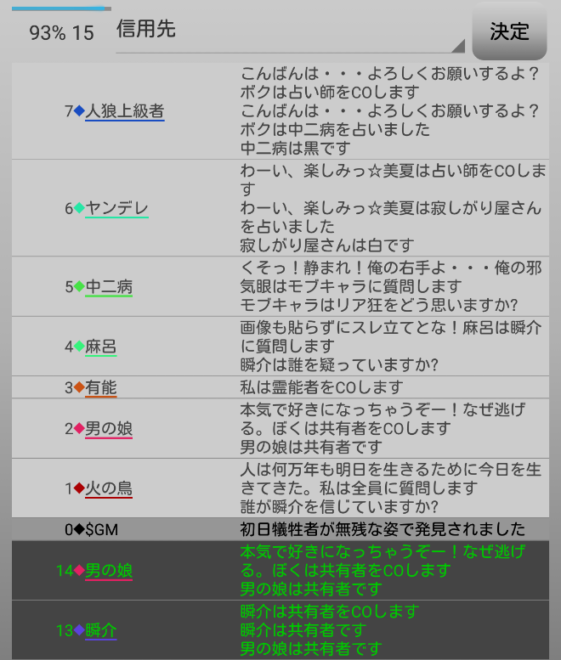 現在の発言表を見るに、1日目の吊りは中二病(●持ち)か霊ロラ、2日目の噛み先は男の娘(共有者)だろう。2日目に俺は生存しているはずだ。