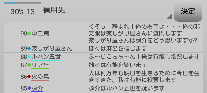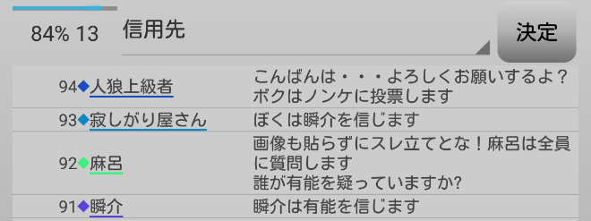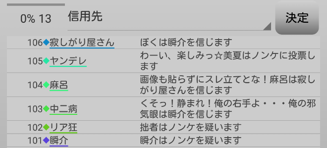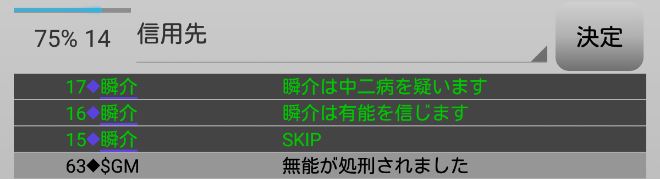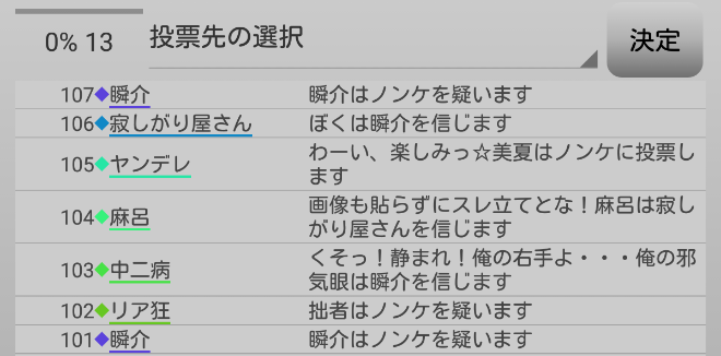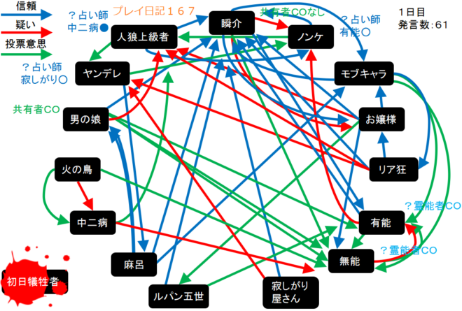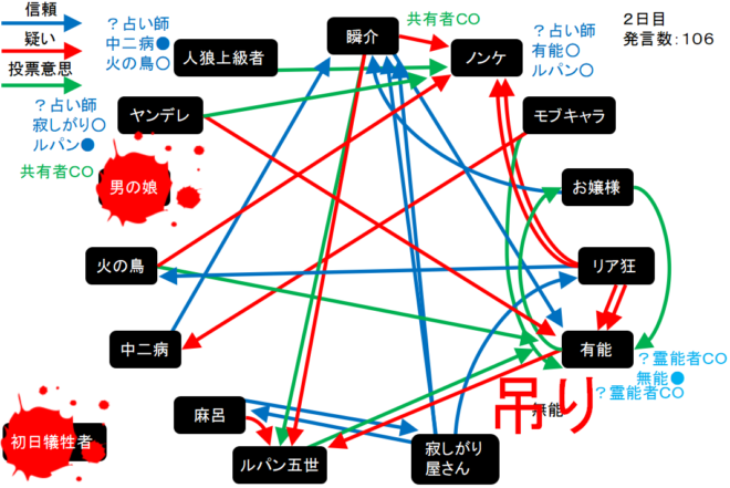 1日目に中二病へ投票先を質問しまくれば良かった(泣)。例えば無能(人狼)へ投票矢印を飛ばしたのならば人狼ではないと判別できたのだ(泣)。