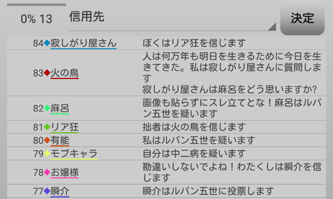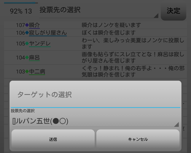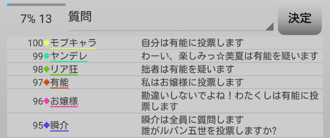 瞬介「ルパンが妖狐で道連れが起きれば一気に2人の占い師が破綻する。中二病を吊るのが安全な気もするが賭けてみよう。『俺はルパンに投票をします!』」