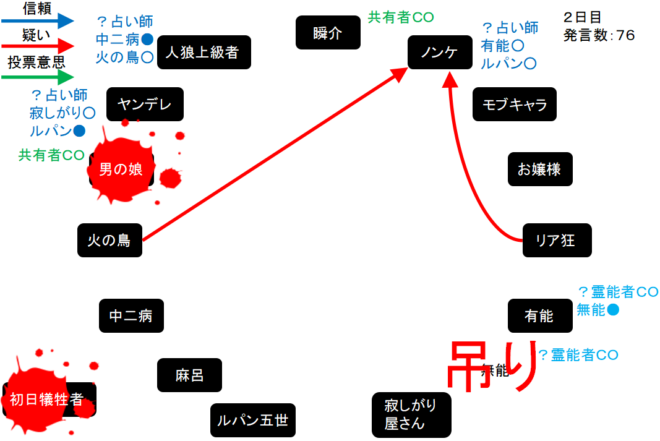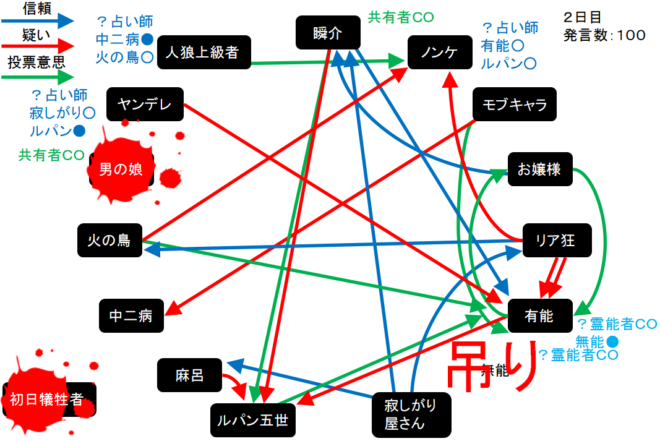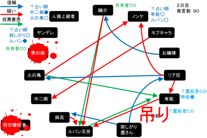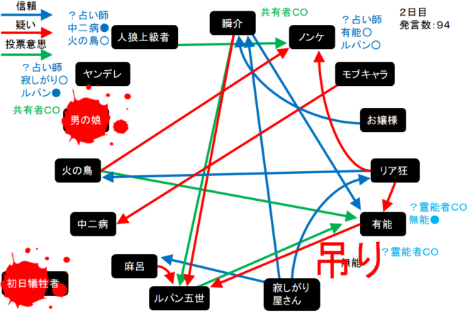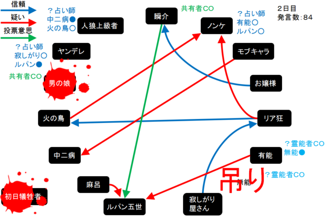 瞬介「共有者のCO結果を作ってきた(上の図)。それでは!呪殺が出たら嬉しい。2日目よ来い来い!そいっ!」