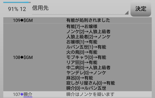 瞬介「中二病が真●だった場合。人狼のノンケは破綻を恐れて無難な偽○を出したいと考えるだろう。そこへグレーを減らしたくない(占い師吊りまで時間を稼ぎたい)と考えた狂信者ヤンデレが同じルパンへ●を出したのかもしれない」