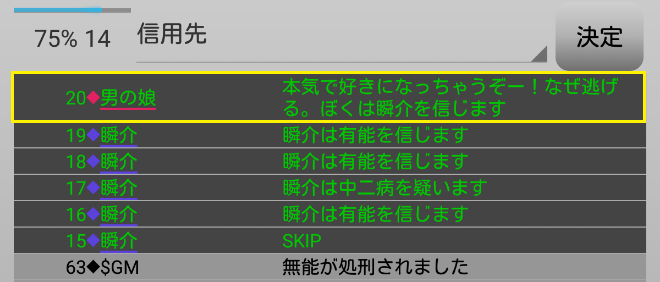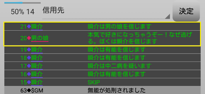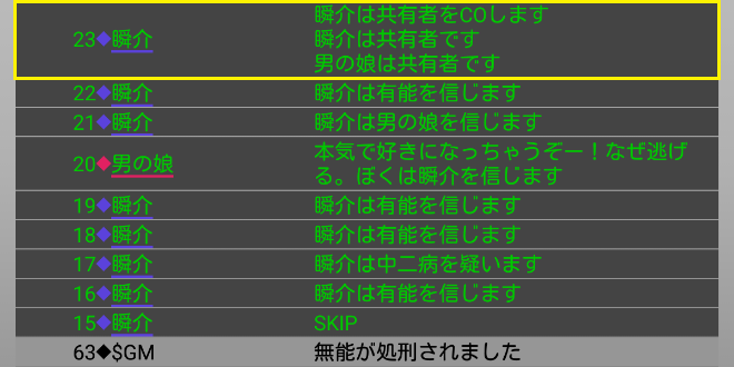 瞬介「決心がついた。俺の役目は真霊能者の有能を1日でも長く守り、役職者であることを明かして(グレーを減らして)真占い師の呪殺を援護することだ!共有者COをします!僕は『男の娘の相方共有者です!』」