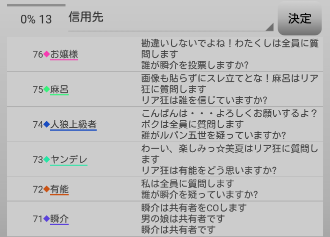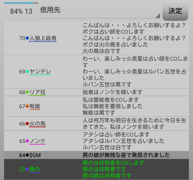 占い師達の占い結果は人狼上級者が火の鳥○、ヤンデレがルパン●、ノンケ(人狼)がルパン○だ。ヤンデレとノンケの結果が白黒パンダになっている。
