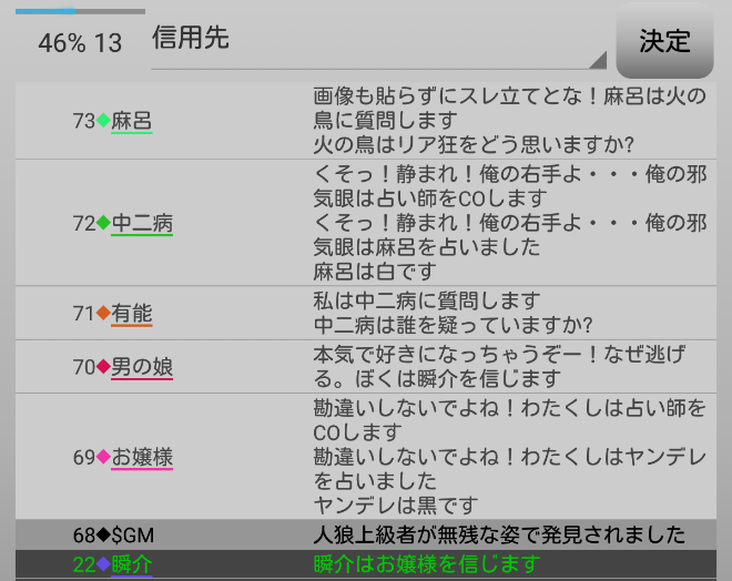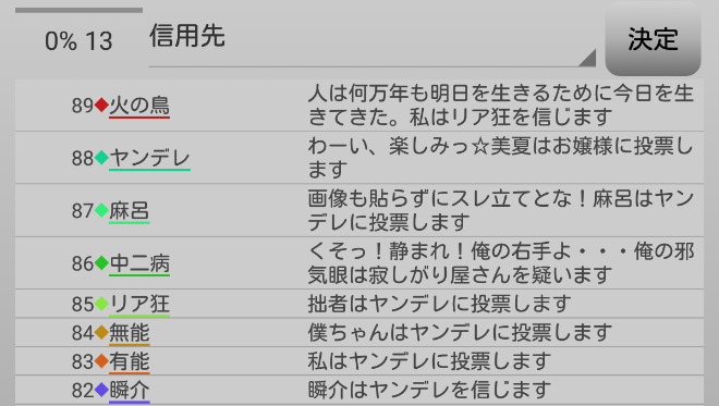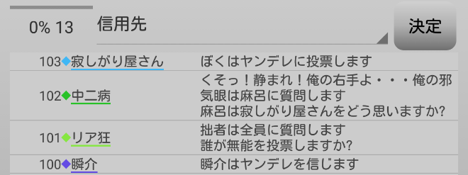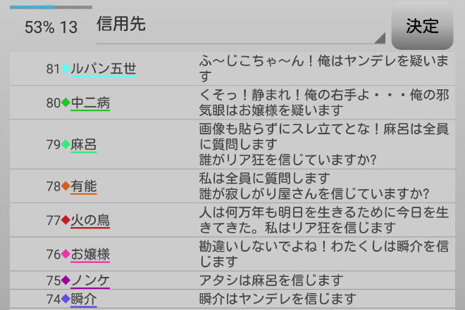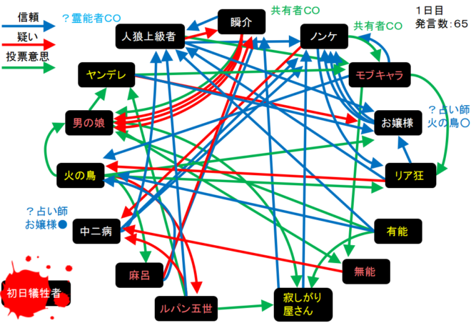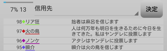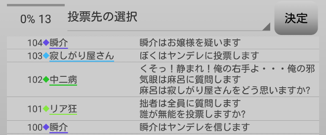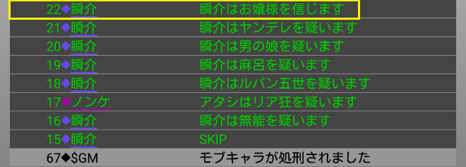瞬介「ノンケはリア狂を疑っているそうだ(上の図)。リア狂は黄色(妖狐候補)のプレイヤーだな」