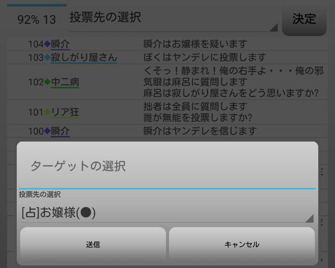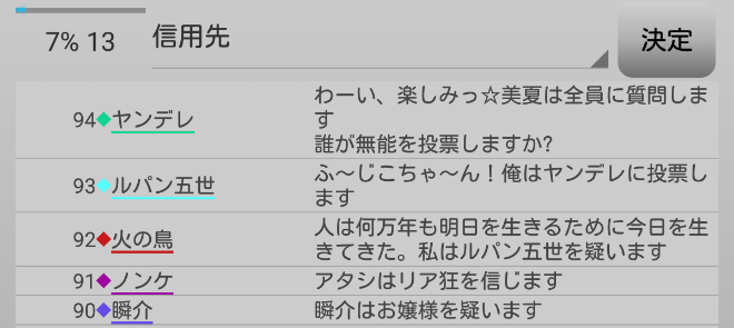 じゃあ今日は何をしようか。人狼っぽいルパンや男の娘を疑い続ければ吊れるのか?お嬢様を疑い続ければ信頼度を下げられるだろうか。
