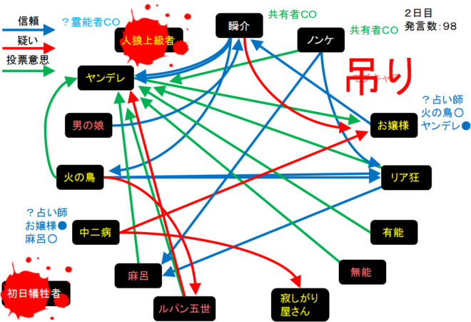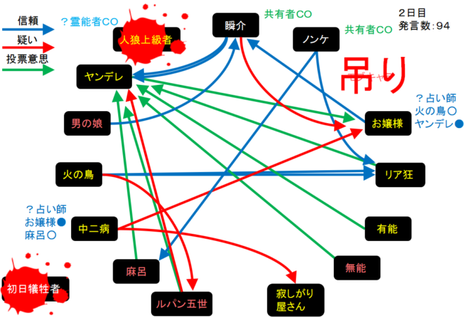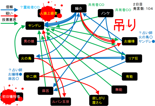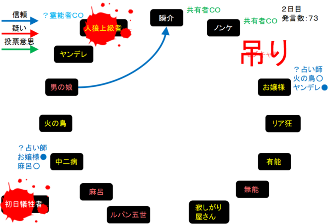 瞬介「ヤンデレを疑っておけと発言をしておいた(上の図)。うん!なかなか有意義な相談ができたんじゃないかな?あとは真役職者を信頼しろと助言をして2日目を迎えようぜ」