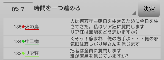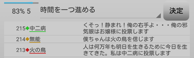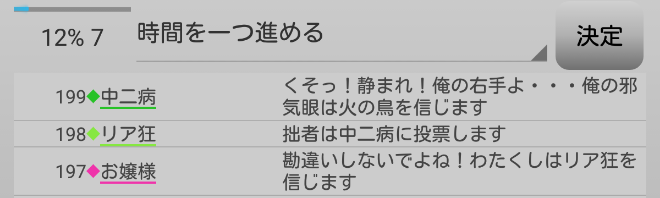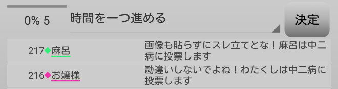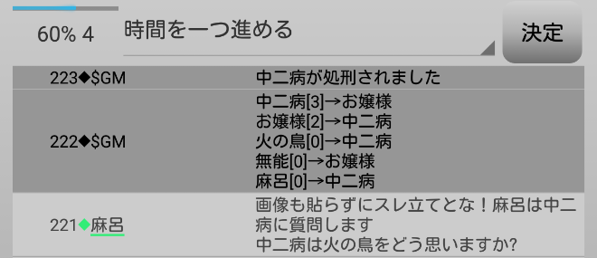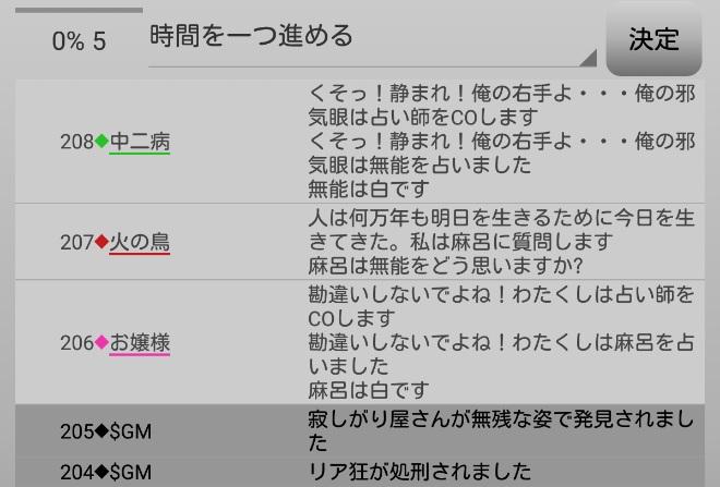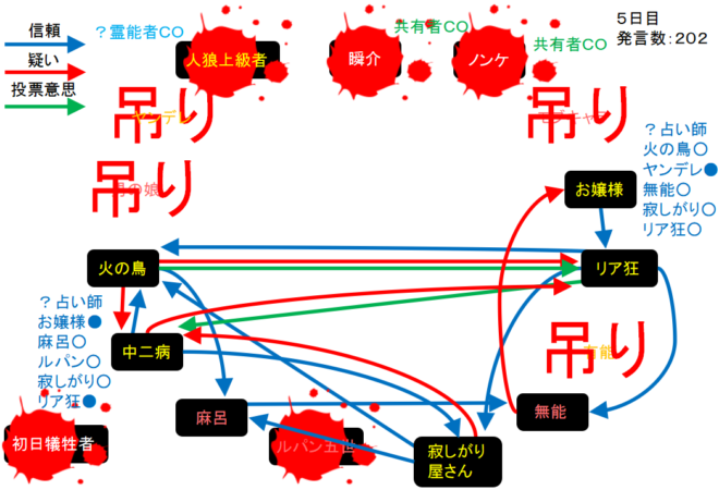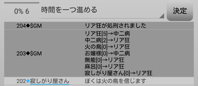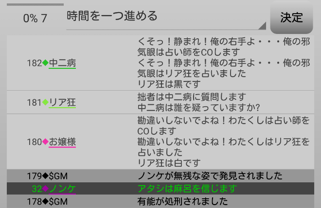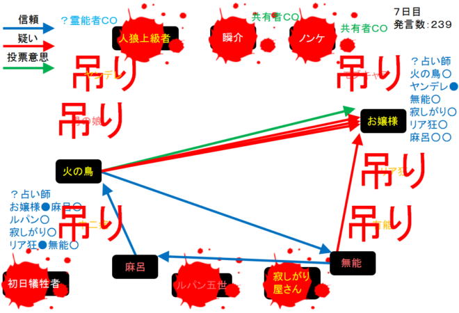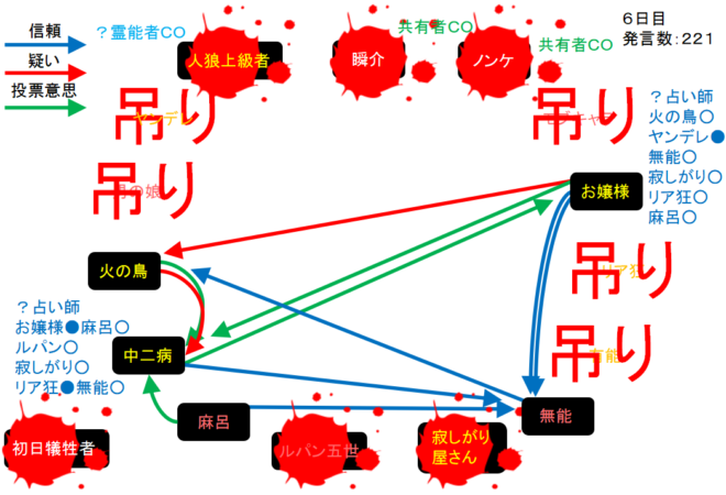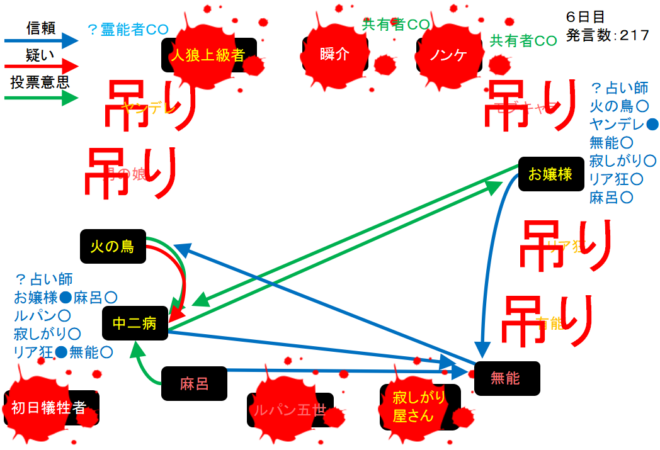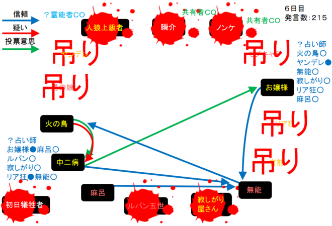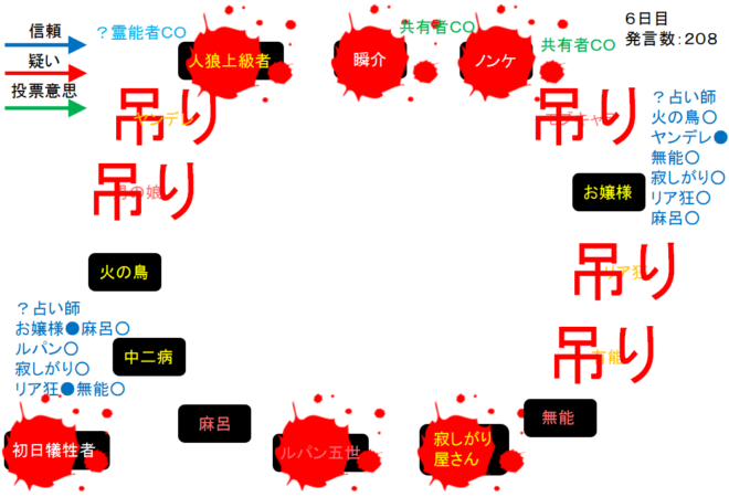 中二病が処刑をされました。明日の7日目はお嬢様が処刑されるのかな?3人しかいないので7日目の議論は最後まで飛ばします。それでは!7日目よ来い来い!そいっ!
