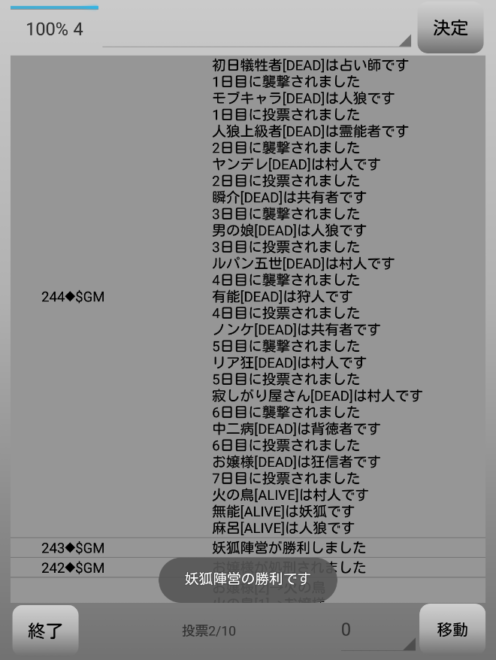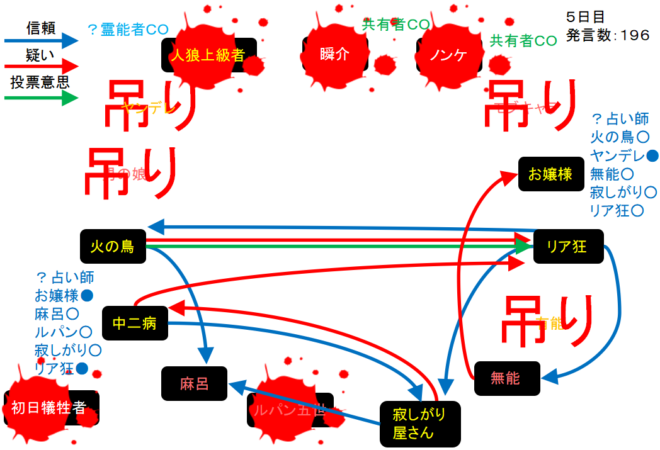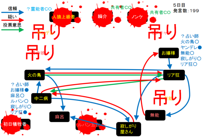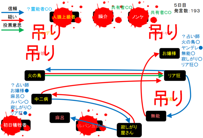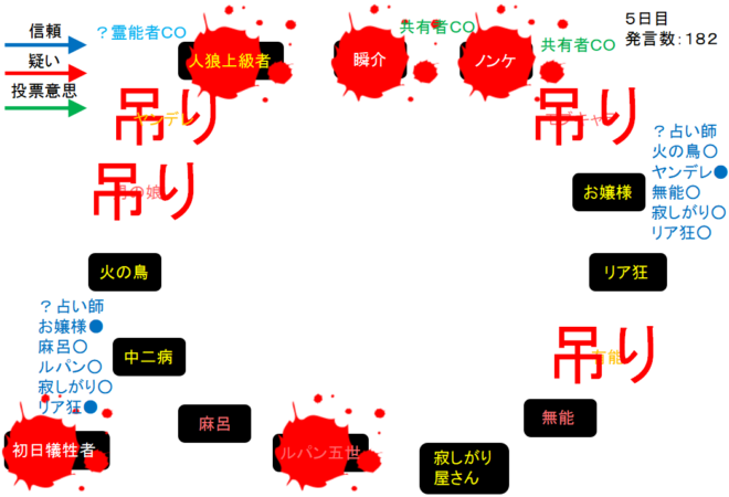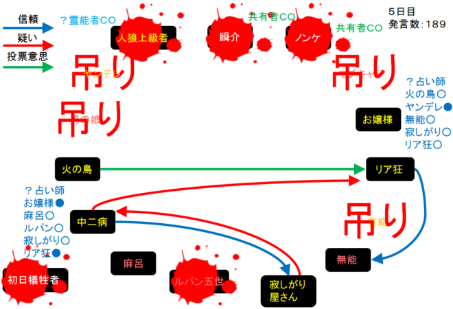 1日目から人狼陣営と妖狐陣営で勝負が繰り広げられていたが、グレランで人狼2匹が吊られてしまい泥仕合になったのだね。リア狂が妖狐で占い師が道連れになったら面白いんだけどな。次にいきます。