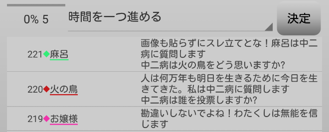 ノンケが噛まれてしまったか。ノンケさんお疲れ。人狼の男の娘を吊ったのはナイスでしたよ。占い結果は中二病がリア狂●、お嬢様がリア狂○か。今日はリア狂吊りかなあ。次にいきます。
