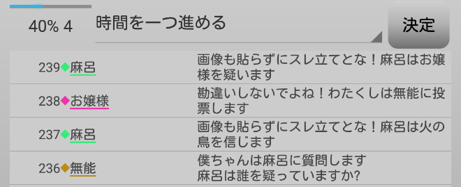 提示された占い結果は麻呂○と無能○。今日は占い師投票になるかもな。人狼陣営は今日を乗り越えればPPで勝てる。次にいきます。