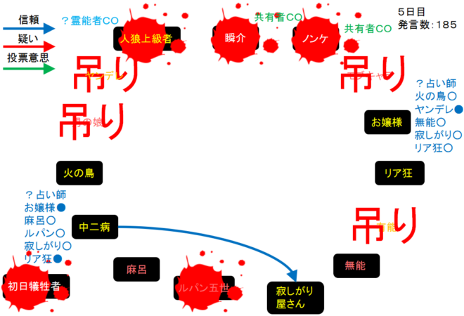 2日目に麻呂○を出した中二病が狂信者だろう。麻呂はお嬢様を吊りたいけど麻呂○を出しているお嬢様に投票をしたら怪しまれる(?)。えーとだから?どうなるんですかね。次にいきます。