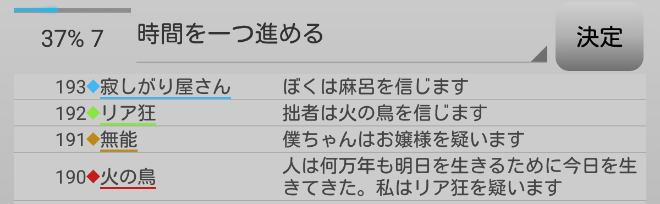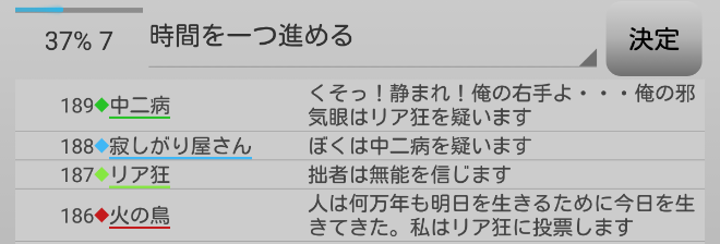 占い師を信用しない恐怖の人狼プレイヤー無能がいる。無能には期待したいね。リア狂のトリッキーな推理も楽しみにしているよ。次にいきます。