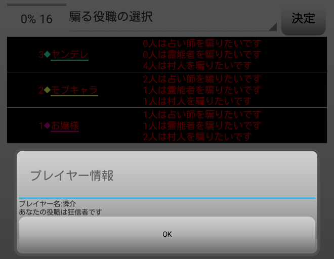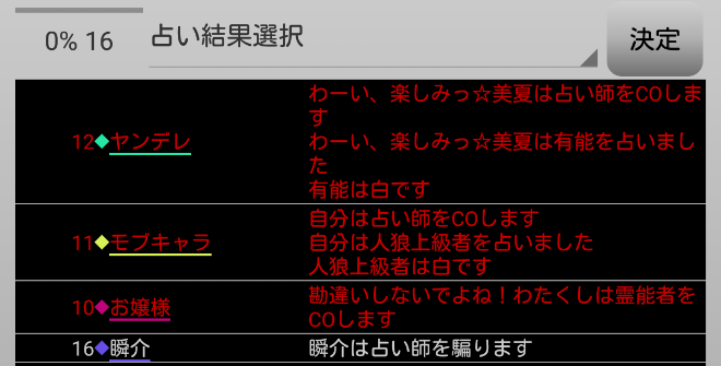 プレイヤーの並び順からCOをするだろうからね。並び順が後ろの方にいるヤンデレは4人目の占い師にはならず潜伏をするのです(たぶん)。
