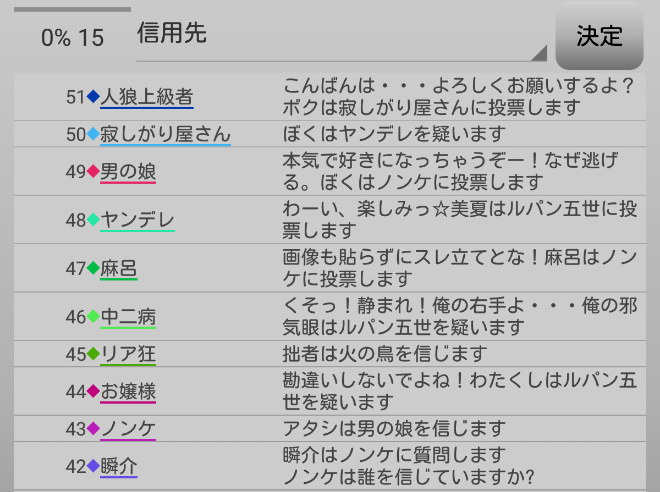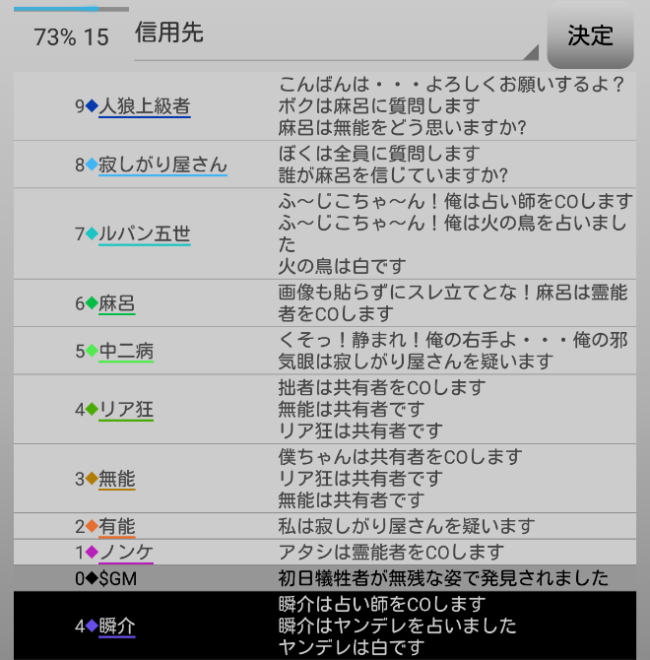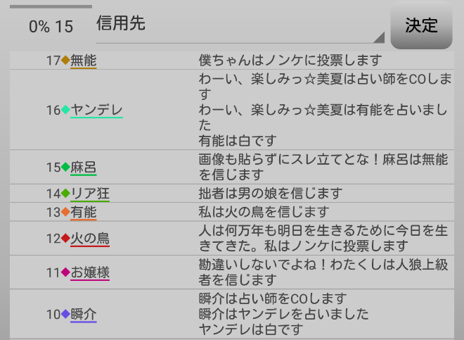 さて、村人と信頼関係を築きたいのならば、例えばリア狂(共有者)が信頼している男の娘を信頼したりしてジワジワと仲間を増やしていけば良い。だが今の俺は偽占い師だからな。妖狐を探すことに全力を尽くそう。