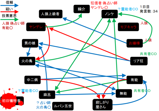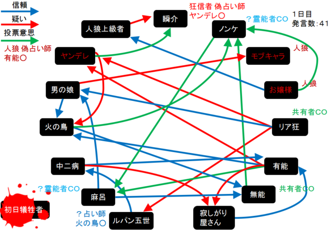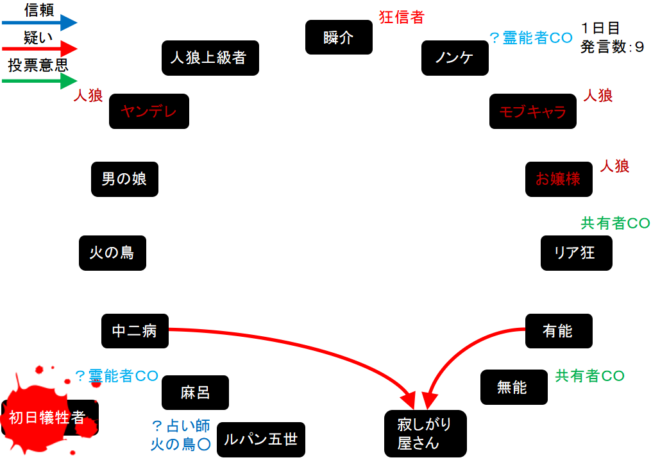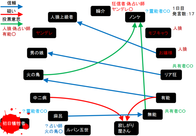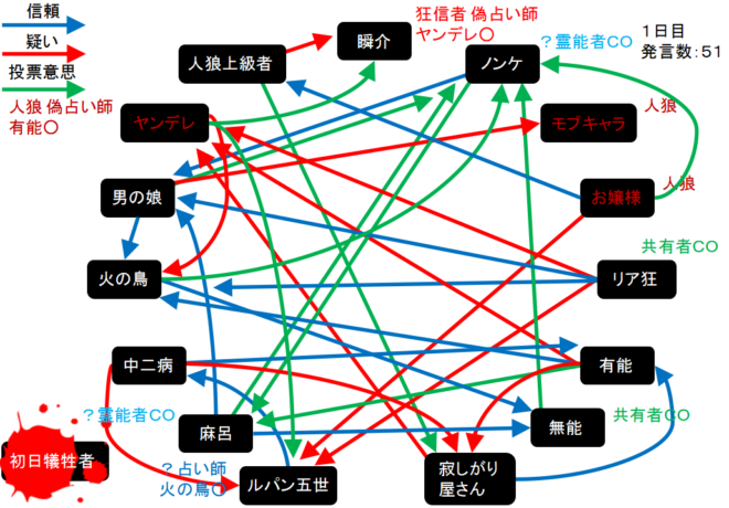 瞬介「人狼陣営の配役は上図のようになった。この場合、占い師が『真』-『狂』-『狼』になるとすればモブキャラが3人目の占い師となりヤンデレは潜伏に切り替える(たぶん)」