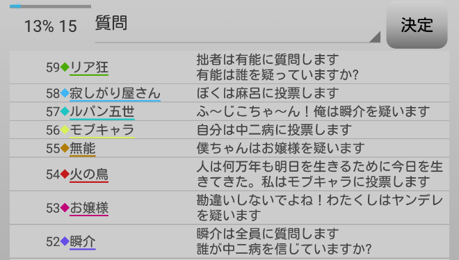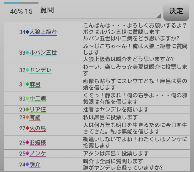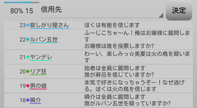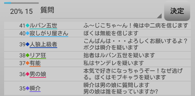 次はヤンデレを疑っている者がいないか全員に質問をしてみよう。『誰かヤンデレを疑っている人はいませんか?』。