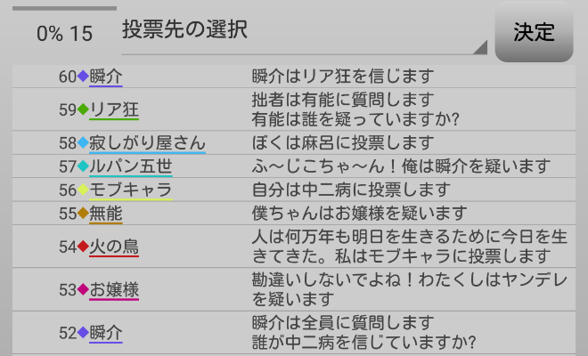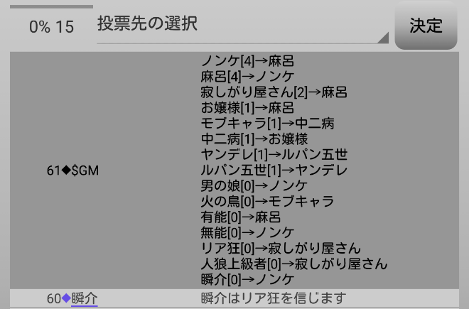 瞬介「議論はこれで終わり。投票の時間になります。俺は背徳者を残して真霊能者を吊りたい。どちからといえばノンケが真霊能者に見える。『ノンケへ投票』をしよう」
