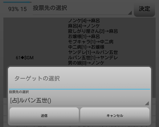 そして火の鳥がグレーのモブキャラへ投票宣言をした。潜伏人狼達が怪しまれている。まずいことになったあ。明日はモブキャラ(人狼)あたりに○を出した方が良いかもしれない。