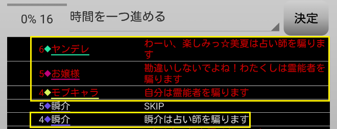 瞬介「ヤンデレ(人狼)が有能○で占い師COをした。てっきりモブキャラがCOをすると思っていたけど(名前の順番で発言するから)、ヤンデレが占い師としてCOをした方がグレーが少なくなるのでモブキャラは潜伏に切り替えたのかな(妄想)」