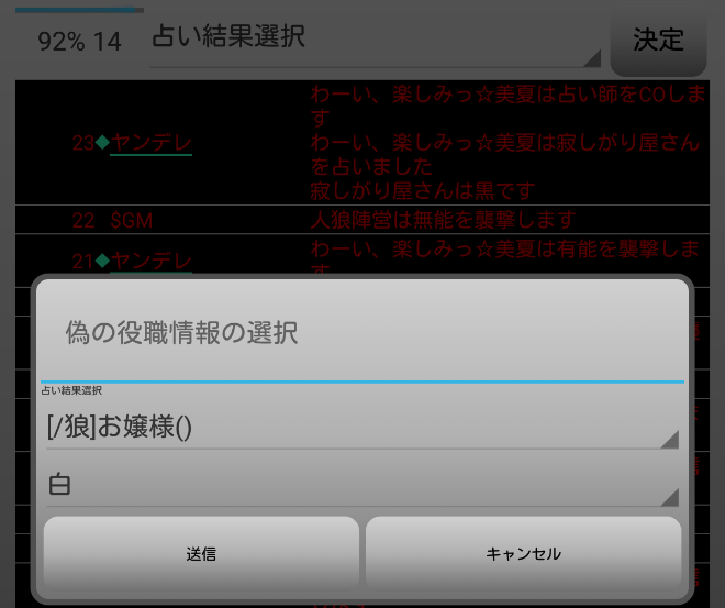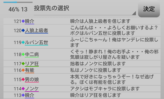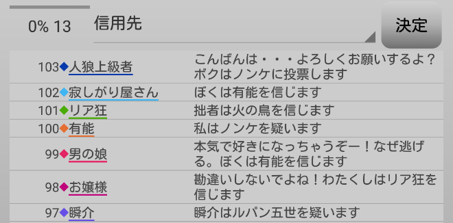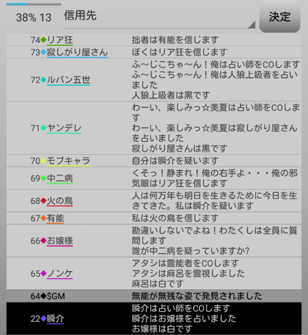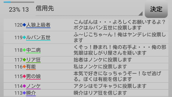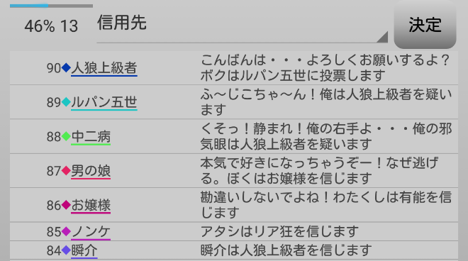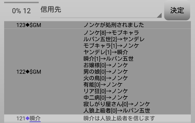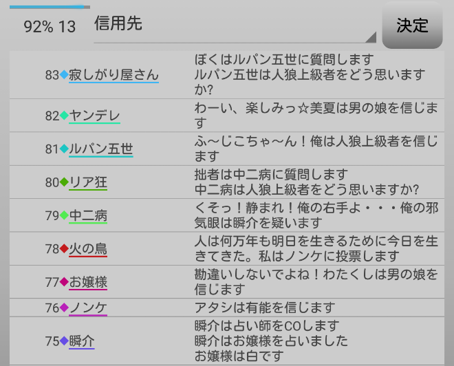 人狼上級者を軸に信頼関係を築こうかな?やつは近いうちに吊られるだろうか。うーむ、共有者のリア狂が信頼発言を集めているね。俺も仲間に加わろう。『俺はリア狂を信頼しています!』。