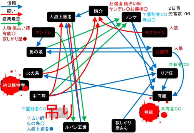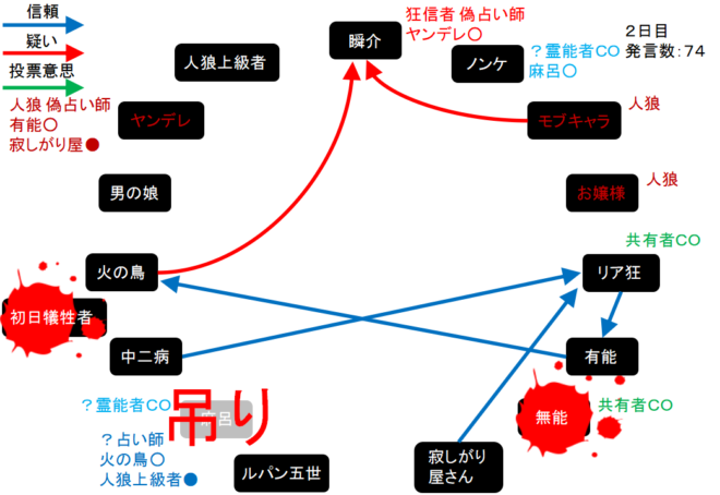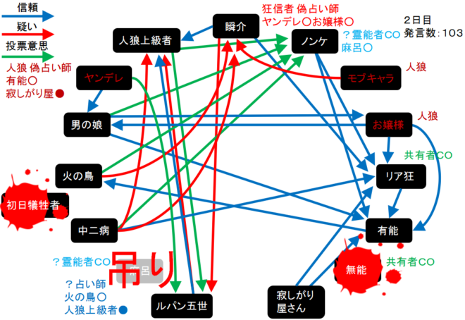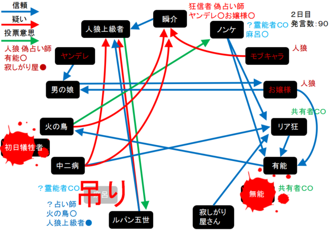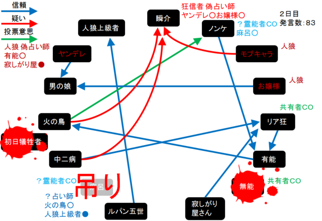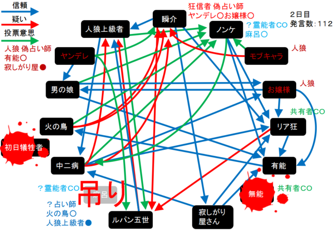 瞬介「人狼達は共有者の無能襲撃を実行、そしてヤンデレは寂しがり屋さんに●を出すらしい(上の図)。この場合、俺も寂しがり屋さん●を出して占い先を合わせるべきだろうか。それとも別の村人に○か●を出そうか?」