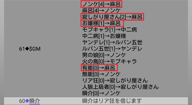 真占い師は『麻呂(処刑された)に投票』をしており、なおかつ『占い師を疑っている者』を占う気がします。赤で囲んだのは麻呂投票者です。