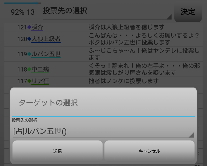 瞬介「議論はこれで終わり。投票の時間になります。対抗占い師の『ルパンへ投票』をしよう」