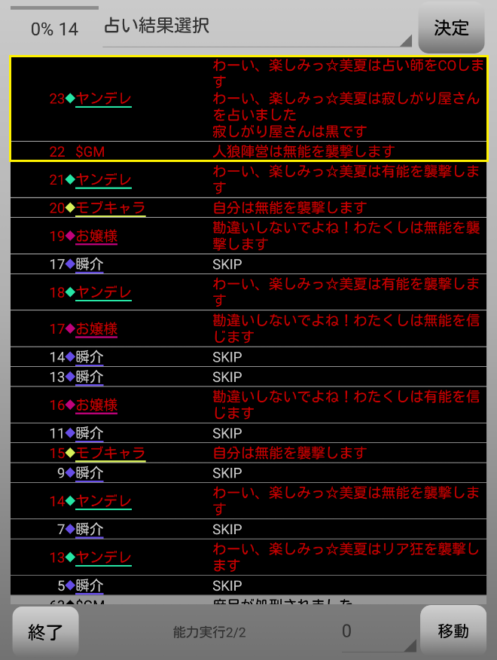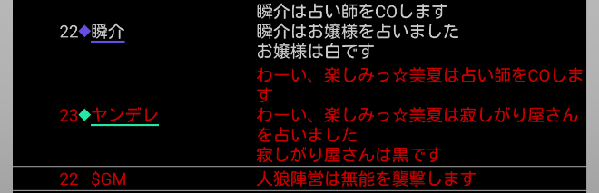瞬介「寂しがり屋さんを占う局面かな?しかし、背徳者候補から信頼された男の娘も気になる。人狼達の会話を聞いてから判断しよう」