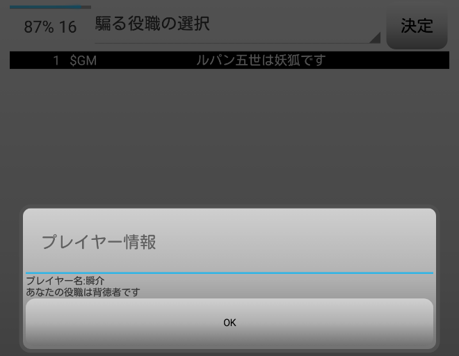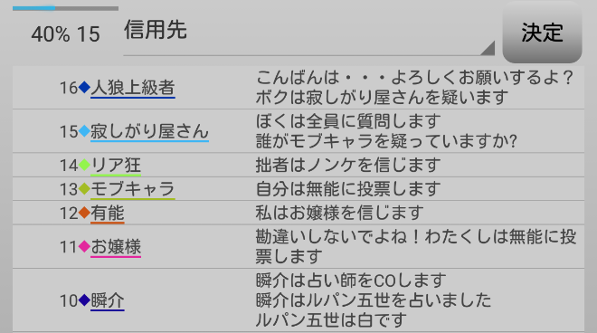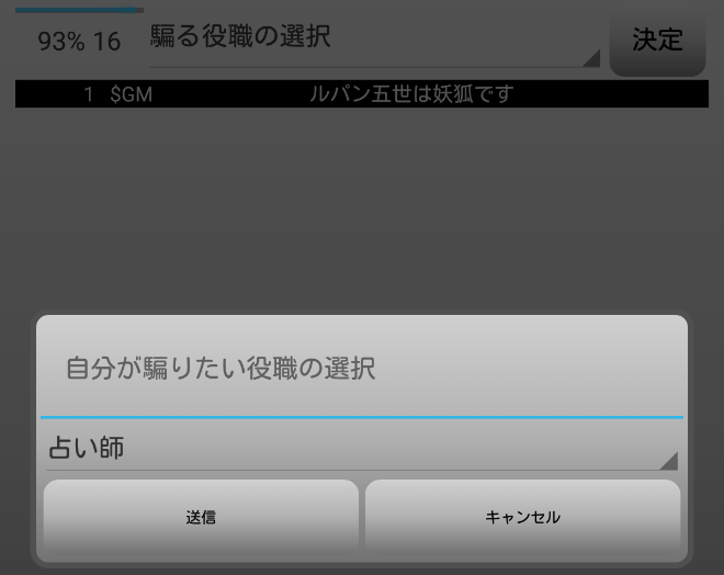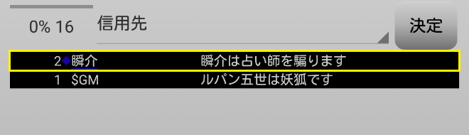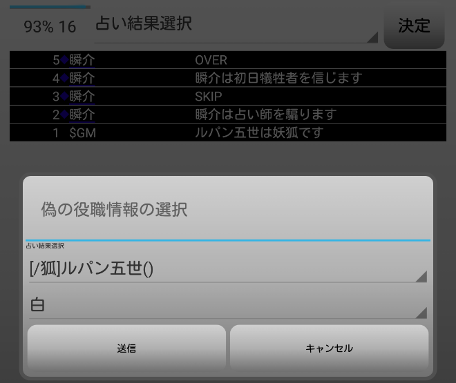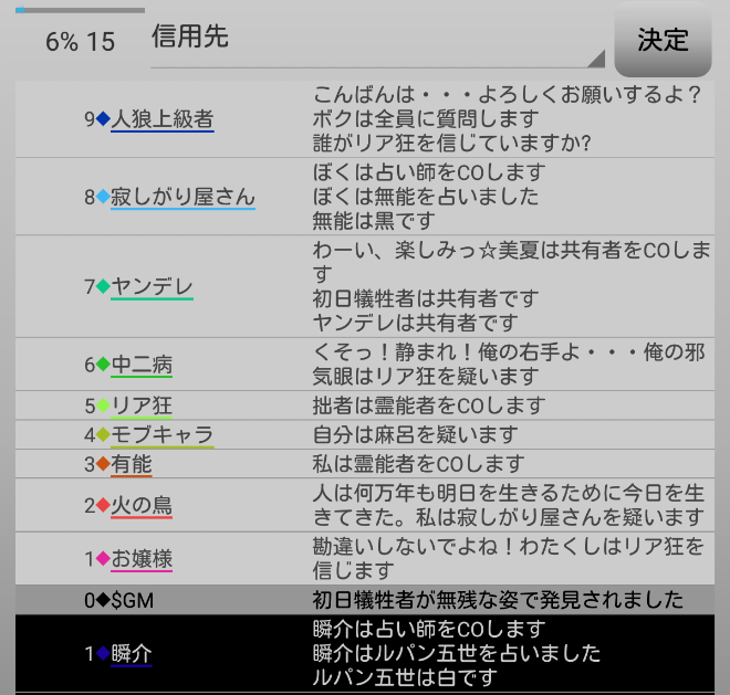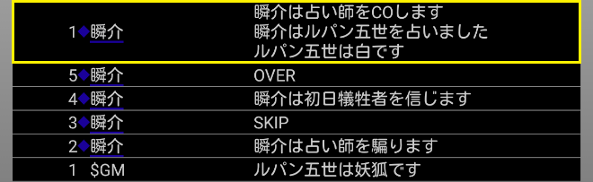 瞬介「占い師を選択しました(上の図)。1日目に妖狐ルパンへ○を出そう。2~3日目に出すのは運任せの博打になる。博打は言い過ぎかな」