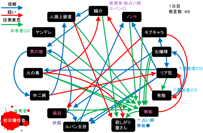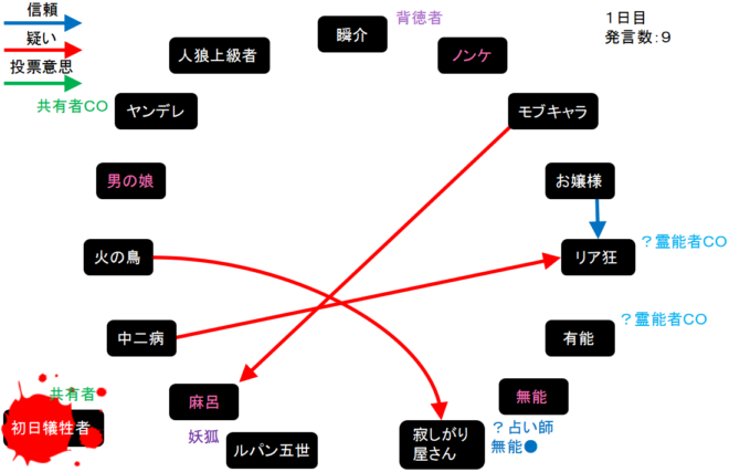 瞬介「妖狐の正体はルパンか(上の図)。ルパンは協調性が低いので(?)、占われやすい気がする。俺(背徳者)は偽占い師を担当するか?」