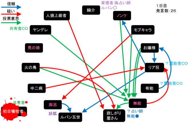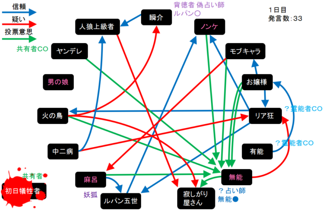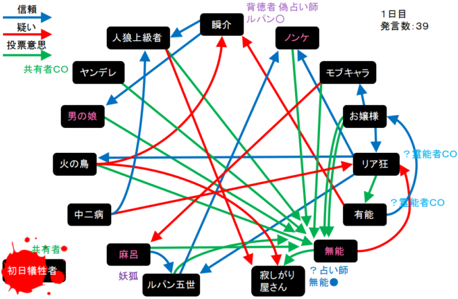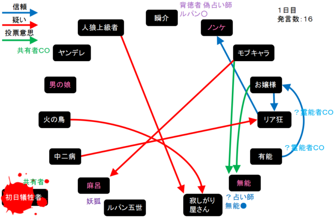 瞬介「ルパン○の占い結果を作ってきた(上の図)!それでは!いきなり呪殺をされたら空しいね。1日目よ来い来い!そいっ!」